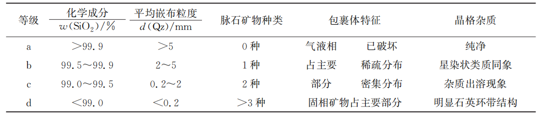 目前國內對于高純石英沒有統一的標準界定。國外學者主要根據石英中的有害元素含量對高純石英進行分類。國內一部分學者僅基于SiO2的純度對高純石英進行分類;一部分學者則基于SiO2的純度和有害雜質元素含量的上限對高純石英進行分類。綜合而言,大部分學者認為單靠化學成分來評判石英品質的優劣具有片面性,評價石英應綜合考慮各種因素。就石英礦物本身而言,除了化學成分,天然石英中雜質元素賦存狀態、石英嵌布特征、包裹體數量大小位置、晶格雜質等所決定的雜質可選性是判斷高純石英原料的重要標準。