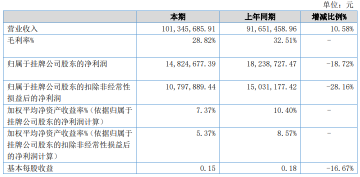營業收入狀況:報告期內公司實現營業收入101,345,685.91元,上年同期91,651,458.96元,同比增長10.58%,主要系報告期內公司產品銷售單價上調所致。