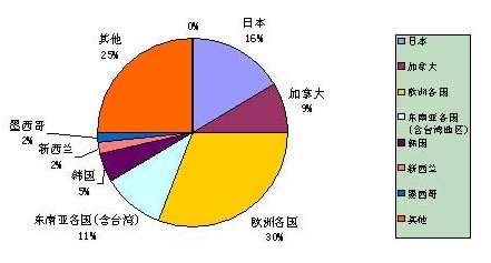 國際上高嶺土的使用市場分布很分散,大體上是經濟越發達國家,高嶺土的使用量越大。據測算,日本的高嶺土年需求量約為130萬噸;加拿大本身不產高嶺土,70萬噸/年的需求全部由美國進口解決;亞洲的東南亞各國(含臺灣地區)年需求量為85萬噸;所占市場份額如下圖所示: