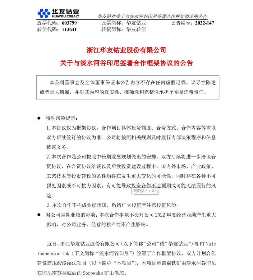 中國粉體網訊 華友鈷業9月13日公告,公司與淡水河谷印尼簽署了合作框架協議,雙方計劃合作建設高壓酸浸濕法項目,項目所需褐鐵礦由淡水河谷印尼在印尼南蘇拉威西的Sorowako礦山供應。