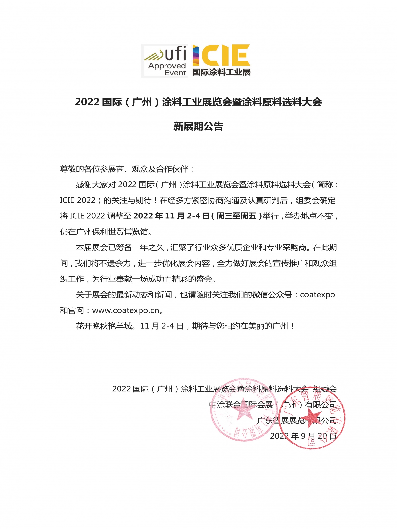 感謝大家對2022國際(廣州)涂料工業(yè)展覽會暨涂料原料選料大會(簡稱:ICIE 2022)的關(guān)注與期待!在經(jīng)多方緊密協(xié)商溝通及認真研判后,組委會確定將ICIE 2022調(diào)整至2022年11月2-4日(周三至周五)舉行,舉辦地點不變,仍在廣州保利世貿(mào)博覽館。
