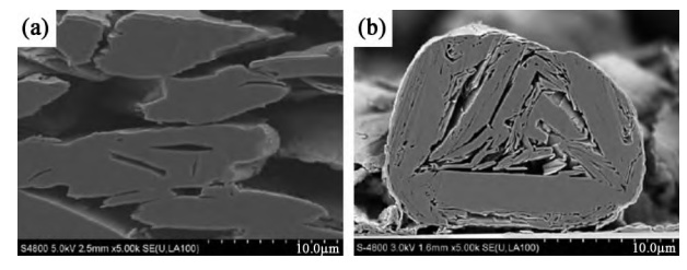 圖1人造石墨(a)和天然石墨(b)的剖面SEM圖(資料來源:炭素技術)