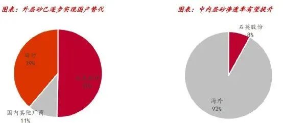 光伏石英坩堝產品端:光伏行業由于產品精密度程度高、技術發展快,對石英坩堝的純度、精度要求日益嚴格。我國的石英制品行業起步較晚,只有少數規模化企業的石英坩堝技術方面達到先進水平。技術上來看,近幾年我國石英制品行業的技術進步較為明顯,尤其是石英坩堝技術水平與國外企業產品的差距逐步縮小,在坩堝尺寸、純度、拉晶時間和拉晶次數等方面均取得顯著進步。此外,國內石英坩堝具有一定的成本優勢,在質量和性能等方面與進口石英坩堝的差距正逐漸縮小。這些都為國產化創造了條件。從細分部件來看,外層砂已基本實現國產替代,中內層砂產品和客戶認可度逐步提升。目前石英股份的高純石英砂仍以外層砂為主,我們預計石英股份在中內層砂質量以及客戶認可度上均有提升,并有望逐步提高中內層砂的滲透率。我們預計21年石英股份外層砂份額約50%,中內層砂份額約8%。