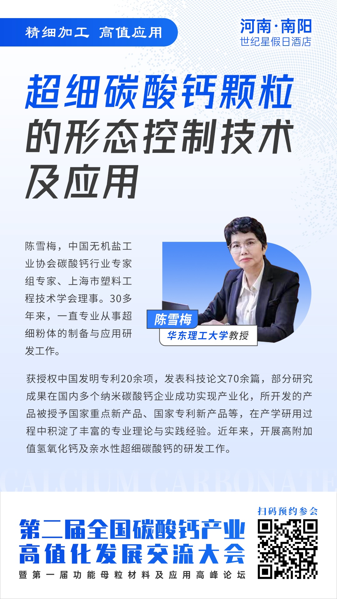 3月16~17日,第二屆全國碳酸鈣產業高值化發展交流大會將在河南·南陽舉行,屆時中國無機鹽工業協會碳酸鈣行業專家組專家、上海市塑料工程技術學會理事、華東理工大學陳雪梅教授將在大會上做“超細碳酸鈣顆粒的形態控制技術及應用”的學術報告,全面深入的闡述主題內容,與參會人員開展深入交流,解答技術難題,心動就要行動,現在就可了解。