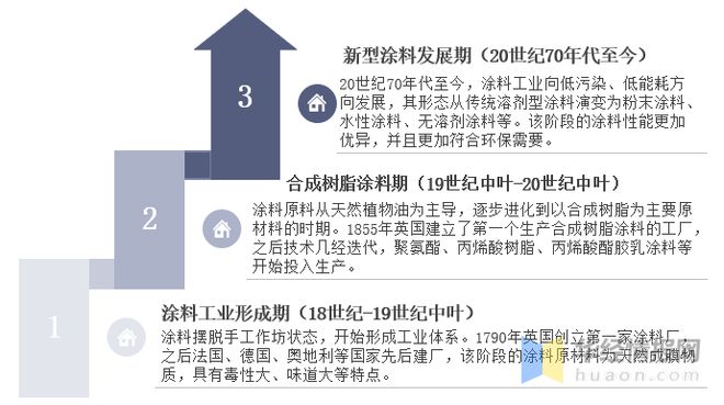 在我國,涂料傳統上被稱為油漆,國家標準將涂料定義為:涂于物體表面能形成具有保護、裝飾或特殊性能(如絕緣、防腐、標志等)的固態涂膜的一類液體或固體材料之總稱。涂料的發展大致可分為以下三個階段: