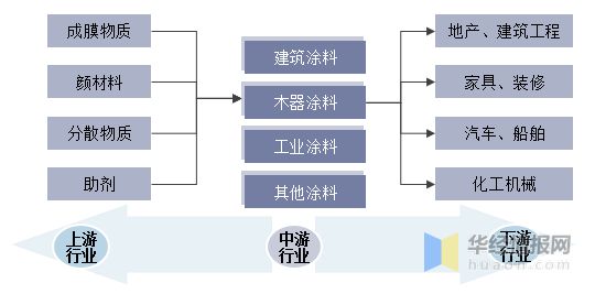 涂料主要包括建筑涂料、木器涂料、工業涂料等,下游空間廣闊。涂料行業的上游產業包括成膜物質、顏填料、溶劑等化工原材料制造業,其中乳液、樹脂、鈦白粉等化工產品為建筑涂料的上游。原材料成本為上游主要成本。下游市場相對廣闊,有著巨大的市場空間,對產品有持續穩定的需求。其中建筑涂料的下游主要是地產行業、建筑工程行業等;木器涂料的下游主要包括木質家具行業、木地板行業、裝修裝飾行業等。