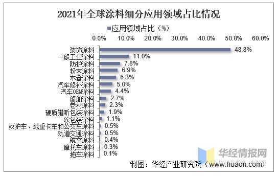 涂料作為一種用于涂裝在物體表面形成涂膜的材料,廣泛應用于各行各業。從具體應用分布看,2021年,裝飾涂料是第一大細分市場領域,應用占比達48.8%;其次為一般工業涂料,占比為11%。