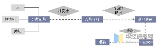 涂料的生產主要是物理分散和混合過程。具體工藝為:研磨分散階段,將水或溶劑、各種助劑加入分散缸中,攪拌均勻后,加入顏填料進行混合分散,必要時進行砂磨,使其能達到本身的初級粒子,并且能保持長期穩定地懸浮在體系中;調漆階段,在分散好的顏料漿中加入成膜物質,充分混勻,消泡,調節粘度。產品檢驗合格后,過濾包裝入庫。