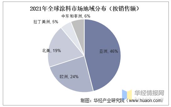 從地域分布來看,2021年亞洲涂料銷售額占全球涂料市場份額的46%,達到788億美元,亞洲最大的涂料生產地為大中華地區,而中國占亞洲涂料市場的60%。亞太地區因原材料成本和勞動力成本優勢,涂料產品的銷售價格相對于歐洲和北美市場更具競爭性。