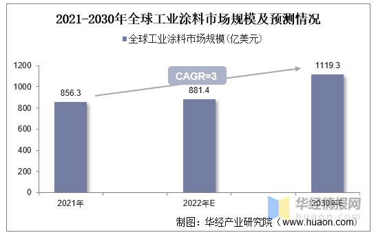 工業涂料是涂料產業的支柱,涵蓋交通涂料、其他涂料等。2021年全球工業涂料市場規模約為856億美元,預計2022年全球工業涂料市場規模將達到881億美元,到2030年全球工業涂料市場規模將超過千億美元,達1120億美元,2021-2030年復合年增長率約為3%。