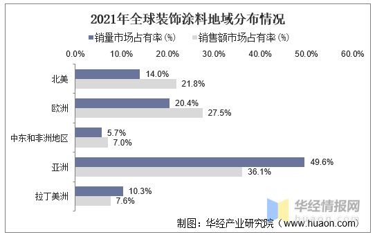 2020年受新冠肺炎疫情影響,人們被限制在家中,導致DIY涂料市場大增,成為北美和歐洲裝飾涂料市場增長的主要原因。另外,2020年房屋住宅市場增速強勁,也是這些地區裝飾涂料市場增長的原因之一。