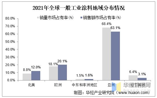 一般工業涂料市場的擴張得益于對防護涂料的需求不斷增加和防腐蝕涂料使用的增加。另一方面,液體涂料對環境的負面影響預計將影響整個工業涂料市場的擴張。亞太地區是一般工業涂料市場增長最快的地區,低勞動力成本吸引了許多外國投資者在亞太地區開展工業活動。2021年亞洲一般工業涂料的銷售量市場占有率和銷售額市場占有率分別為68.4%和63.1%。