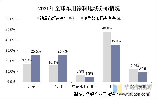 2021年以中國為代表的亞洲地區在車用涂料市場上表現不俗。2021年亞洲車用涂料的銷售量市場占有率和銷售額市場占有率分別為48%和35.4%;而以汽車生產和汽車涂料生產為優勢的北美和歐洲地區并未顯示出其強勢地位。