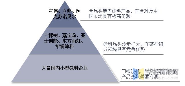 總體來看,涂料制造商可分為三大梯隊。第一梯隊均為外企,具備涂料產品全品類覆蓋的能力,在中國具備極高的市場份額;我國龍頭目前位于第二梯隊,涂料品類正逐步擴大,在細分市場具備相對優勢;第三梯隊反映出我國涂料整體現狀,即存在大量生產低質量、賺取微薄利潤的制造商。
