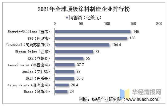 全球涂料市場由外資企業主導。從競爭格局來看,2021年涂料行業銷售額前十企業均為外資企業,合計占全球涂料市場份額的46%,競爭格局相對分散,國內涂料企業仍有巨大的成長空間。其中,宣偉以145億美元的銷售額位列榜首,其次是龐貝捷和阿克蘇諾貝爾,銷售額分別為138億美元、104.4億美元。