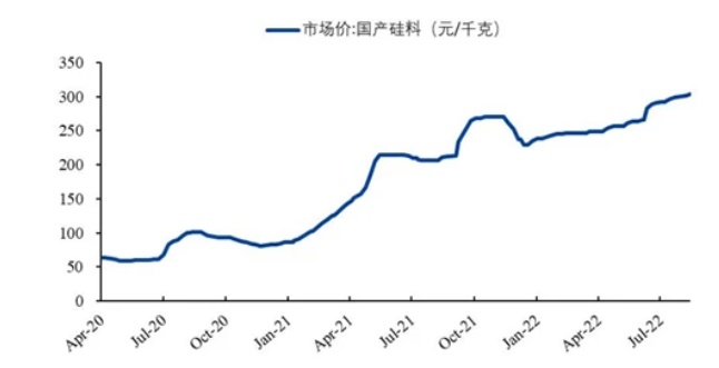 回顧近年來的硅料價格,數據顯示,2020年初以來,硅料價格從約70元/kg上漲至2022年三季度的303元/kg,累計漲超三倍,刷新近十年新高。