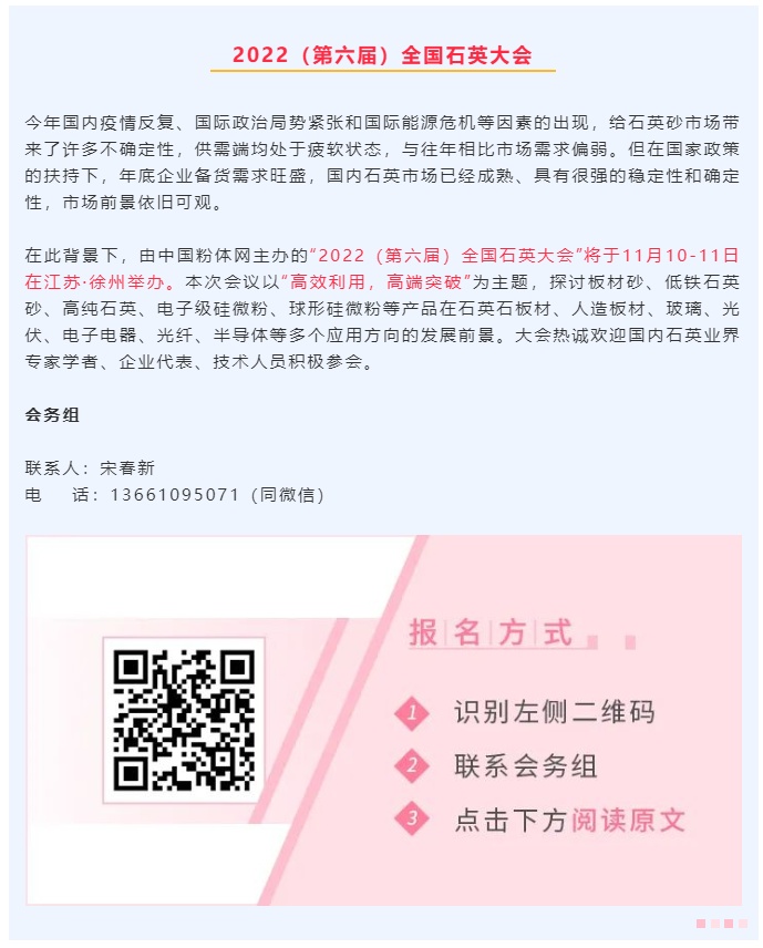 由中國粉體網(wǎng)主辦的“2022(第六屆)全國石英大會”將于11月10-11日在江蘇·徐州舉辦,河南首泰環(huán)保設(shè)備有限公司邀您一同參加。