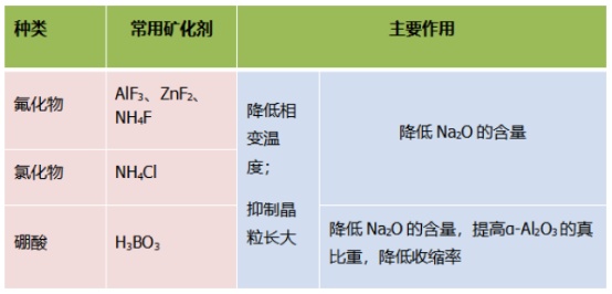 礦化劑的主要作用是能夠增大氧化鋁晶格缺陷,形成陽離子和陰離子空位,從而有助于加速結(jié)晶,有效降低α相變的溫度;同時,礦化劑還能和氧化鋁中的氧化鈉反應(yīng),生成易揮發(fā)的鈉合物,所以礦化劑廣泛應(yīng)用于高溫氧化鋁的煅燒工藝中。不同類型礦化劑的工作過程各不相同,其機理基本相似,通過降低α相變的形核激活能,降低煅燒溫度100~200℃,常用的礦化劑有氟化鋁、硼酸、氧化鎂和硝酸銨等。