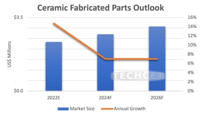 TECHCET高級分析師Karey Holland博士表示,隨著2020年設備市場升溫,半導體工廠已安裝設備以及新設備的部件需求顯著增長,強勁的增速一直持續至今年上半年。盡管近期存儲半導體市場出現疲軟跡象,但隨著新設備不斷交付,陶瓷部件市場增長態勢仍將延續,預計晶圓廠資本開支將在2026年之前推動陶瓷部件市場實現8%的復合年增長率。