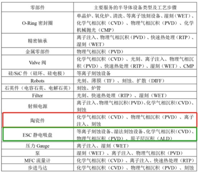 作為半導體生產設備的關鍵部件,Al2O3、AlN和SiC等多種精密陶瓷部件的研發生產直接影響著半導體裝備制造業乃至整個半導體產業鏈的發展。從上表我們可以看到,精密陶瓷部件在化學氣相沉積、物理氣相沉積、離子注入、刻蝕等一系列半導體主要制造環節均有重要應用。ESC靜電吸盤同樣是貫穿于幾大重要環節的關鍵部件,在上表中它雖然沒有歸于“陶瓷件”一類,但據粉體網編輯了解,目前陶瓷材料是靜電吸盤最熱門的主體材料。可以說,精密陶瓷部件是整個半導體產業基礎中的基礎。