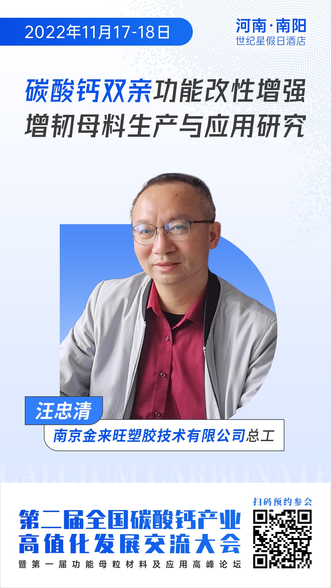 近期,第二屆全國碳酸鈣產業高值化發展交流大會將在河南·南陽舉行,屆時南京金來旺塑膠技術有限公司總工程師汪忠清將在大會上做“碳酸鈣雙親功能改性增強增韌塑料母粒生產與應用研究”主題報告,為參會者講解碳酸鈣在母粒高值化應用與高質量生產技術。