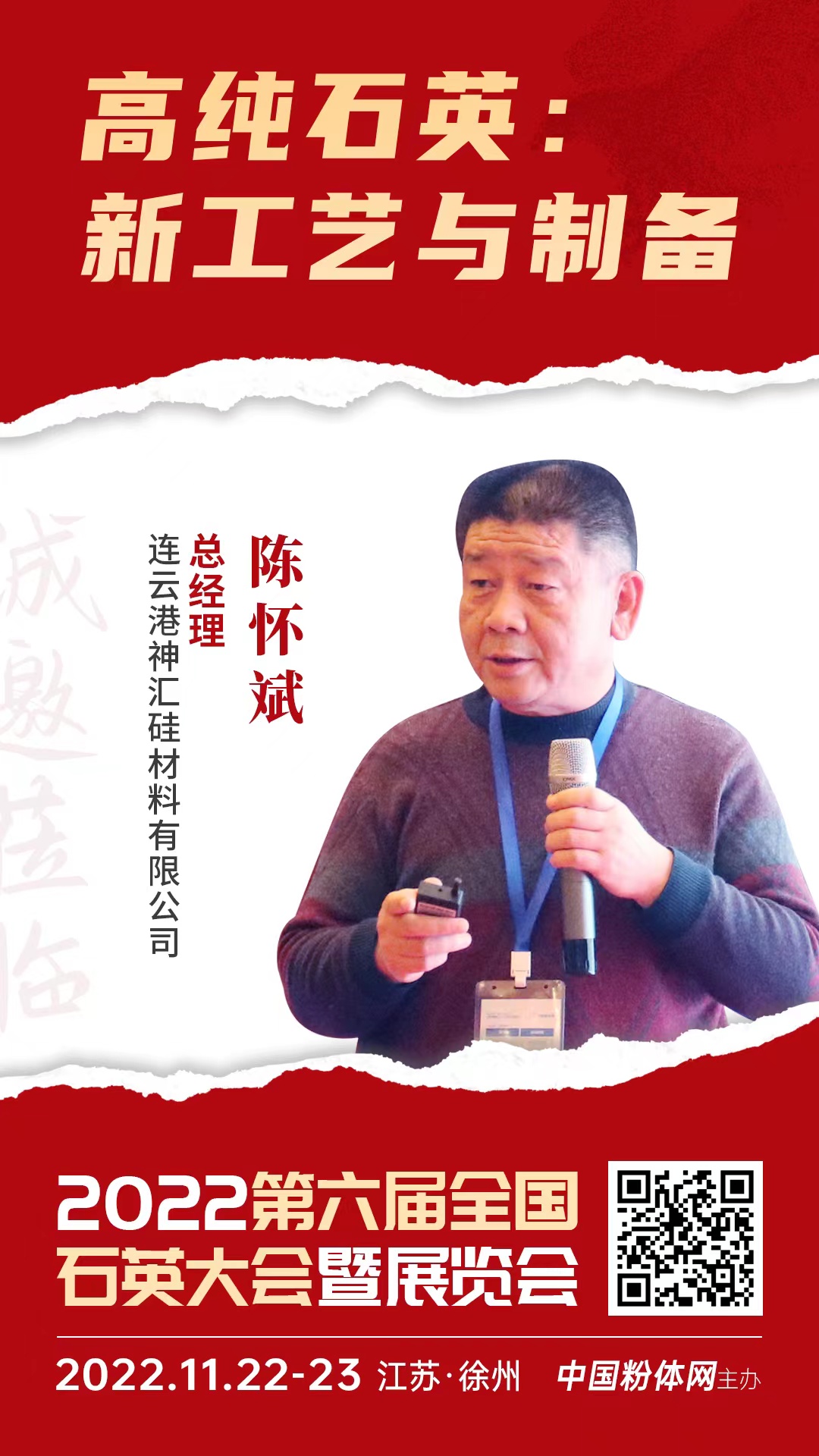 石英的研究提純與加工技術對于國家長遠發展與新材料、新能源戰略具有重大意義。想了解更多石英加工制備新工藝,請關注中國粉體網。2022年11月22日至23日,中國粉體網將在江蘇徐州舉辦“2022第六屆全國石英大會暨展覽會”。來自連云港神匯硅材料有限公司的總經理陳懷斌將帶來題為《高純石英:新工藝與制備》的報告。