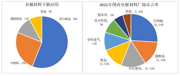 據(jù)高工產(chǎn)研鋰電研究所數(shù)據(jù)顯示,2021年鋰離子電池負(fù)極材料行業(yè)集中度較高,其中貝特瑞、璞泰來、杉杉股份、凱金在國內(nèi)的市場占有率分別為26%、15%、15%、13%,上述四家企業(yè)國內(nèi)市場占有率達(dá)到69%。負(fù)極材料下游主要運(yùn)用為動力電池、儲能電池以及消費(fèi)電池。其中,動力電池使用占56%。這主要是由于新能源汽車市場的快速擴(kuò)張拉動鋰離子電池的需求量,導(dǎo)致負(fù)極材料出貨量的驟增。目前國內(nèi)負(fù)極材料企業(yè)產(chǎn)能共計(jì)約94萬噸,增長較快,但行業(yè)集中度還在不斷提高。