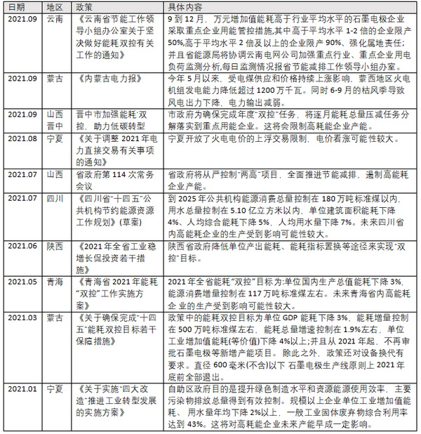 但是,我國近年能耗管控嚴(yán)格且出臺了“雙控”政策,對能源總耗較高的地區(qū)進(jìn)行預(yù)警,并提出“2025年單位GDP能耗和碳排放比2020年分別降低13.5%、18%”的目標(biāo)。因此,各地區(qū)為達(dá)到“雙控”目標(biāo)、降低能源總耗,也陸續(xù)出臺一系列能源限制的政策,導(dǎo)致在2021年時存量石墨化產(chǎn)能開工率受到壓制,能評審批難度進(jìn)一步加大,因此也將影響下游負(fù)極材料的出貨。