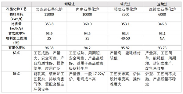石墨化環(huán)節(jié)的高耗能主要來自石墨化工藝。目前,石墨化工藝分為三類,分別是坩堝法、箱式法和連續(xù)法。坩堝法為當(dāng)下普遍的石墨化工藝,代表企業(yè)包括杉杉股份、璞泰來等。坩堝法技術(shù)相對成熟,但坩堝法單位能耗較高且存在環(huán)保問題。而箱式石墨化爐與連續(xù)式石墨化爐在單位能耗上優(yōu)勢明顯。但目前連續(xù)式石墨化爐工藝尚不成熟,離商業(yè)化還有較長距離。箱式石墨化工藝在少數(shù)行業(yè)企業(yè)發(fā)展較好,代表企業(yè)為河北坤天新能源股份有限公司,坤天新能源利用多年使用箱式爐積累的經(jīng)驗(yàn),自主設(shè)計(jì)、組裝爐體結(jié)構(gòu),不斷優(yōu)化工藝、提升能效,并實(shí)現(xiàn)高品質(zhì)負(fù)極材料的持續(xù)量產(chǎn)。但是箱式石墨化爐工藝門檻較高,對企業(yè)在爐體設(shè)計(jì)、操作以及技術(shù)上均有著較高要求,因此真正掌握的企業(yè)非常有限。