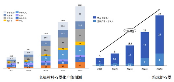 另外在各頭部負(fù)極材料企業(yè)的石墨化工藝產(chǎn)能分布方面,坩堝爐石墨化工藝仍將作為主流的石墨化工藝,箱式爐石墨化工藝在新增產(chǎn)能中占比較少。