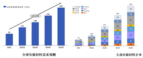 未來在新能源車以及儲能領(lǐng)域快速發(fā)展的帶動下,負(fù)極材料的需求仍呈現(xiàn)高速增長態(tài)勢。預(yù)計(jì)2025年全球負(fù)極材料需求將達(dá)到294萬噸。從各頭部廠家的產(chǎn)能布局來看,頭部負(fù)極材料企業(yè)產(chǎn)能總計(jì)達(dá)443萬噸。