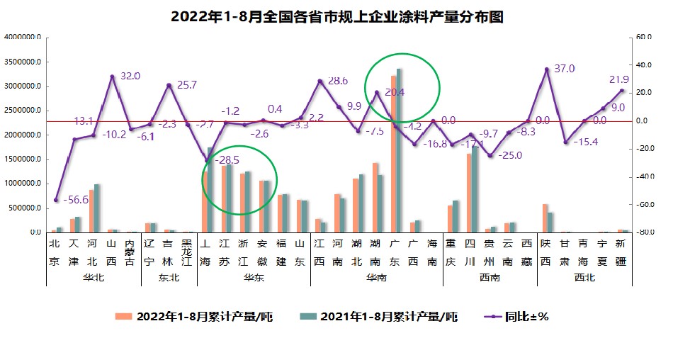 報告顯示,2022年1-8月,我國涂料行業全行業總產量約2259.7萬噸,同比下降4.3%;主營業務收入總額約2897.6億元,同比下降2.0%;利潤總額約141.1億元,同比下降26.0%。具體到各省來看,1-8月大多數省份涂料產量同比都有所下降,廣東、上海下降幅度最大,深受“口罩”問題反復的影響。