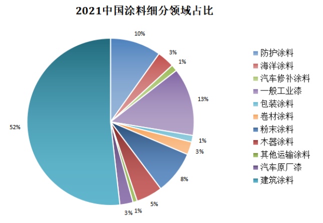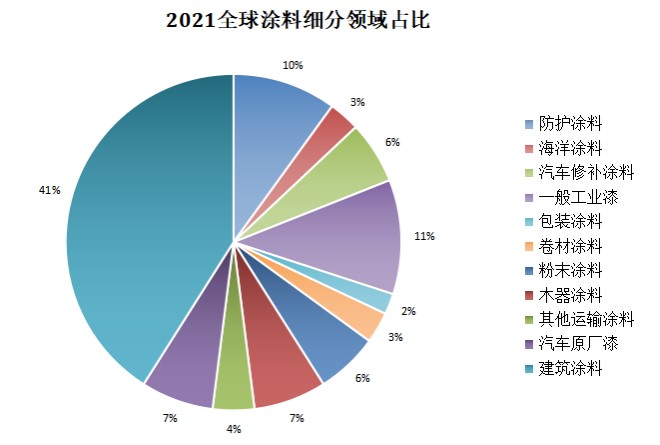 從2021年中國與全球涂料行業細分對比來看,中國涂料行業細分領域占比與全球涂料細分領域占比并無太大差異,建筑涂料占比最大,其次是防護涂料。不同的是,中國建筑涂料占比52%,比全球涂料占比高出10個百分點,但在工業涂料、木器涂料、汽車原廠漆、運輸涂料等領域,中國占比普遍都比全球要小,說明這些領域還有很大發展潛力。