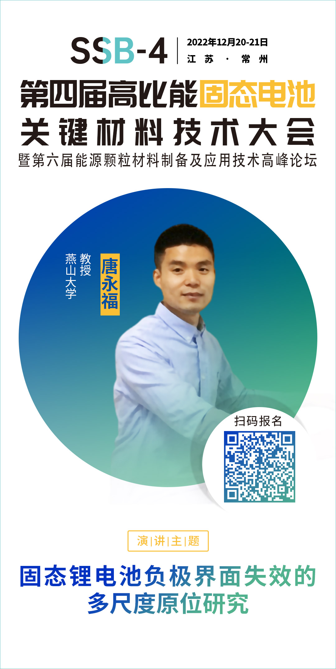 針對固態電池相關的技術、材料、市場及產業等方面的問題,中國粉體網將于12月20-21日在常州舉辦第四屆高比能固態電池關鍵材料技術大會,為致力于固態電池技術開發的企業,科研院校,以及電動車、儲能、特種應用等終端企業提供信息交流的平臺,開展產、學、研合作,共同推動行業發展。屆時,燕山大學唐永福教授將作題為《固態鋰電池負極界面失效的多尺度原位研究》的報告。報告將介紹近年來通過原位透射電鏡、原位掃描電鏡等多尺度可視化手段對鋰枝晶及負極界面失效力-電-化學耦合特性的原位研究,直觀解析不同固態電池體系鋰枝晶的形成及演化機制,提出鋰枝晶抑制的可能策略,為長壽命、高安全固態鋰電池的設計與開發提供參考。