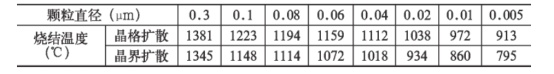 粉體顆粒尺寸與燒結溫度的關系(燒結擴散活化能Q=418KJ/mol)