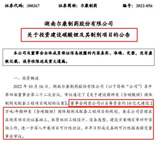 中國粉體網訊 近日上市藥企爾康制藥(300267.SZ)發布《關于投資建設碳酸鋰及其制劑項目的公告》。公告稱,公司董事會同意以自籌資金約10億元建設2萬噸/年精神類(含碳酸鋰)固體制劑及配套工程項目的規劃,要求公司管理層在現有項目論證基礎上,抓緊組織工程設計、設備選型、建設方案確定等對外咨詢工作,進一步深入開展項目可行性論證,并早日形成完善的可行性報告。