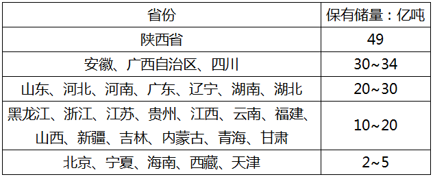 保有儲量廣泛分布于除上海市以外29個省、直轄市、自治區,其中陜西省保有儲量49億噸,為全國之冠。
