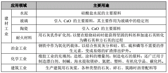 石灰石是制備水泥、玻璃、電石、純堿等的原料,也可以直接加工成石料和碎石料,用作建筑材料。此外可加工生成生石灰、碳酸鈣,應用于冶金、環保、醫藥、橡膠、塑料、造紙等眾多領域。