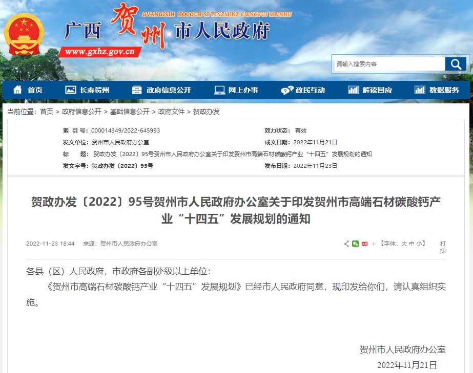 中國粉體網訊 2022年11月22日,賀州市人民政府辦公室印發了《賀州市高端石材碳酸鈣產業“十四五”發展規劃》(以下簡稱:《規劃》),并將“強龍頭重大項目”和特色“園中園”建設重大項目視為產業規劃核心內容。