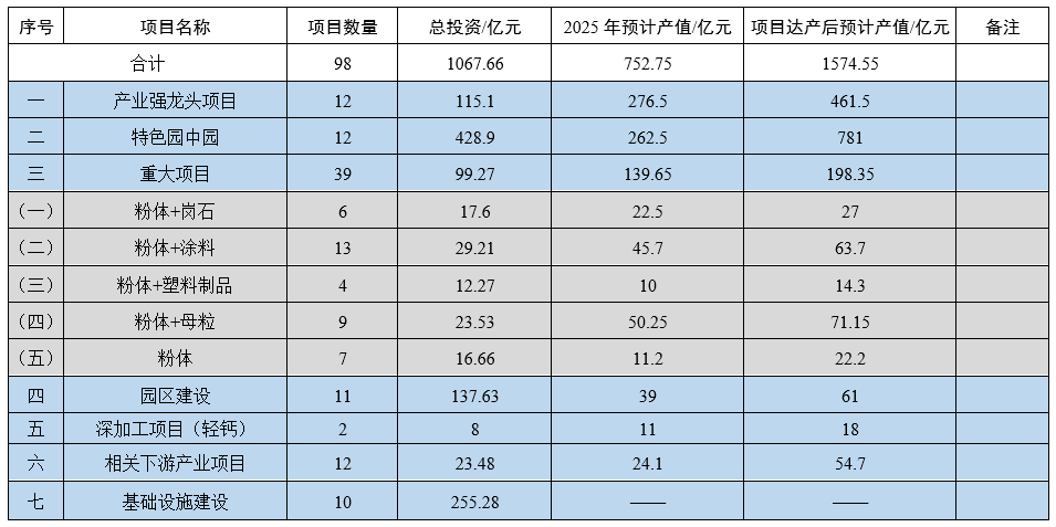 賀州市高端石材碳酸鈣產業“十四五”重大項目匯總表