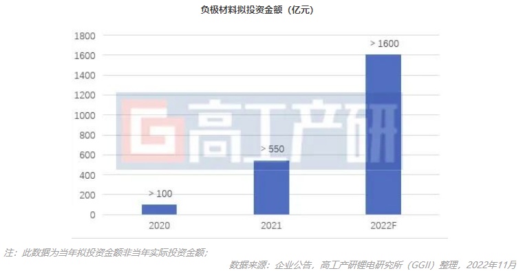 中國粉體網訊 據高工產業研究院(GGII)不完全統計,2020-2022年中國負極材料項目擬投資金額超2200億元,其中2021年擬投資金額超550億元,2022年擬投資金額超1600億元,同比增長超200%。主要因為2021年市場需求暴漲,導致石墨化產能緊缺,于是企業加速投資擴產,行業外企業也不斷涌入。