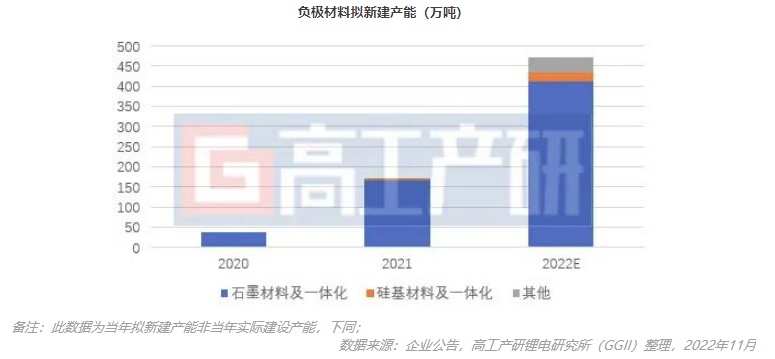 1)2023年負極材料市場投資會趨于冷靜。2022年以前整個行業對市場前景預期較為樂觀,為搶占市場份額,企業產能規劃超前,負極材料擬新建產能已遠超市場需求,規劃總產能達需求的5倍,產品價格下滑,未來將出現產能結構性過剩。GGII預計2023年行業擬新建項目投資額將下滑到800億以內,且已簽約項目建設進度可能慢于預期。