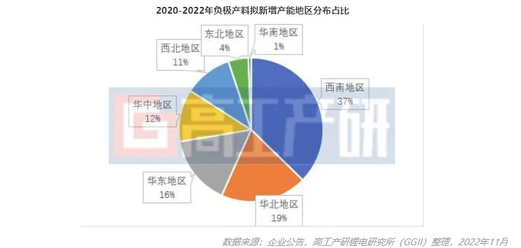 從區域分布來看,西南、華北、華東地區產能比較集中,占比超70%。未來西南地區會繼續成為負極材料的建設熱門區域,西北地區因其電價低廉,未來區域內負極材料產能布局會進一步增加。