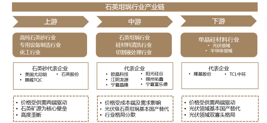 石英坩堝行業上游主要為高純石英砂行業、坩堝設備制造、化工等行業,其中,高純石英砂是石英坩堝的關鍵原材料,光伏級石英砂主要用于制造石英坩堝,直接影響硅的成晶(整棒率、成晶率、加熱時間、直接加工成本等)以及單晶硅的質量(穿孔片、黑芯片等),對石英砂雜質、羥基、包裹體含量,以及粒度分布要求嚴苛。