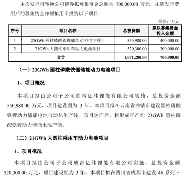 億緯鋰能表示,公司募集資金扣除發行費用后將用于23GWh圓柱磷酸鐵鋰儲能動力電池項目、21GWh大圓柱乘用車動力電池項目,分別擬投入募資40億元、30億元。
