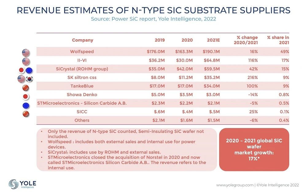 SICC是另一家專注于射頻應用的碳化硅晶圓公司,于1月在上海交易所上市,為位于上海臨港保稅區的生產n型碳化硅晶圓的工廠融資。據Yole報道,其產能目標是在2024年達到每年30萬片6英寸n型碳化硅晶圓。