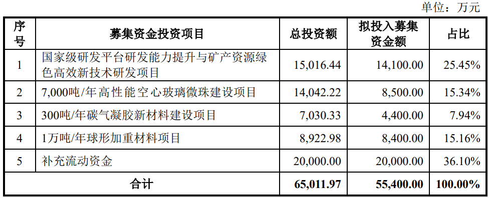 公司本次擬公開發(fā)行不超過(guò)101,372,242股,募資5.54億元投向國(guó)家級(jí)研發(fā)平臺(tái)研發(fā)能力提升與礦產(chǎn)資源綠色高效新技術(shù)研發(fā)項(xiàng)目、7,000噸/年高性能空心玻璃微珠建設(shè)項(xiàng)目、300噸/年碳?xì)饽z新材料建設(shè)項(xiàng)目、1萬(wàn)噸/年球形加重材料項(xiàng)目及補(bǔ)充流動(dòng)資金。