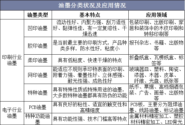 按照應用場景的不同,油墨材料可分為印刷行業油墨和電子行業油墨。其中,按照印刷方式,印刷油墨分為凹印油墨、膠印油墨、柔印油墨、網印油墨和特種油墨,主要應用于各類別印刷物和塑料陶瓷等;電子油墨分為PCB油墨和特種功能性油墨,主要應用于PCB板、金屬材料和塑膠材料精密加工、LED背光等。