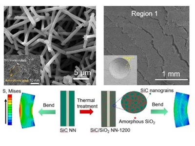 多年來,西安交通大學材料學院王紅潔教授課題組專注于先進結構陶瓷及其多功能化、陶瓷基復合材料、陶瓷增強(輕)金屬基復合材料、陶瓷/金屬焊接等先進陶瓷的研究。近日,王紅潔教授課題組在多孔陶瓷力學性能優化領域取得新進展,該團隊基于自主研發的SiC納米線氣凝膠,結合可控化學氣相浸滲(CVI)技術,開發出了一種輕質高強且對裂紋擴展不敏感的多孔陶瓷。該材料具有低密度(0.36g/cm3)、高強度(16 Mpa)、高模量(326 MPa)等性能特點,同時兼具良好的可壓縮性,壓縮斷裂應變高達50%以上,在機械能量吸收方面展現了巨大的應用潛力。在微觀上,該材料是以柔性單晶SiC納米線為網絡骨架,以納米線表面多晶SiC/非晶SiO2為涂層的復相三維網絡結構。該結構實現了納米線間結點的強化,在保持高變形能力的前提下,提高了納米線三維網絡的承載能力。該研究為設計和制備輕質高強、高可靠性的多孔陶瓷提供了新的思路。