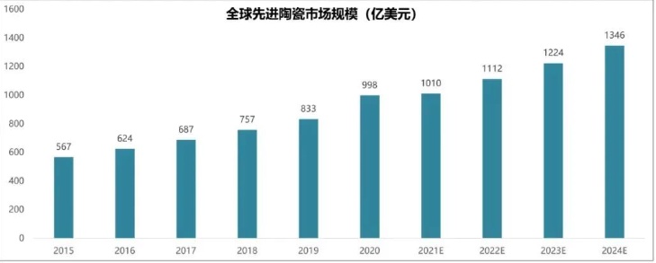 2020年,全球先進陶瓷市場規模約998億美元,到2024年將達到1346億美金,年復合增長率超過8%。目前來看,美國、日本、德國、法國等在先進陶瓷研制和開發及應用領域居領先地位。